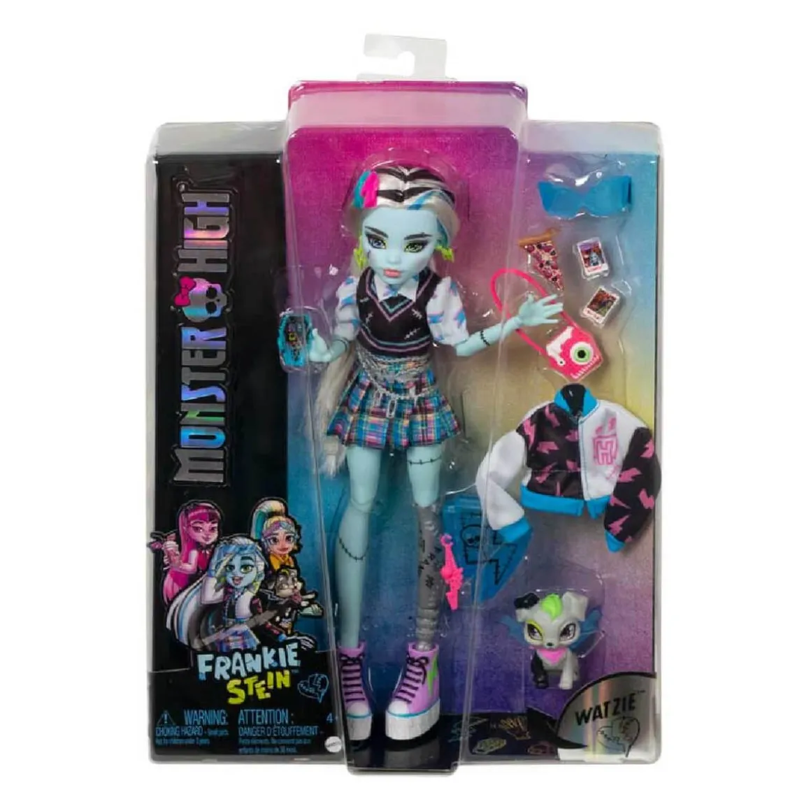 Monster High – Muñeca Frankie Stein, la muñeca Monster High de Frankie Stein con su conjunto azul eléctrico, accesorios y mascota.