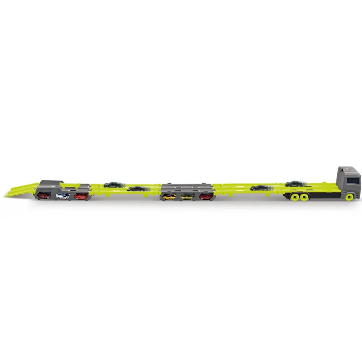 El camión tiene espacio para guardar varios coches en su interior (¡incluye 2 vehículos de metal!) y cuenta con una práctica asa para transportarlo fácilmente donde quieras. Los pequeños pilotos podrán cargar, conducir y desplegar su pista en cualquier lugar, creando infinitas aventuras de motor.
