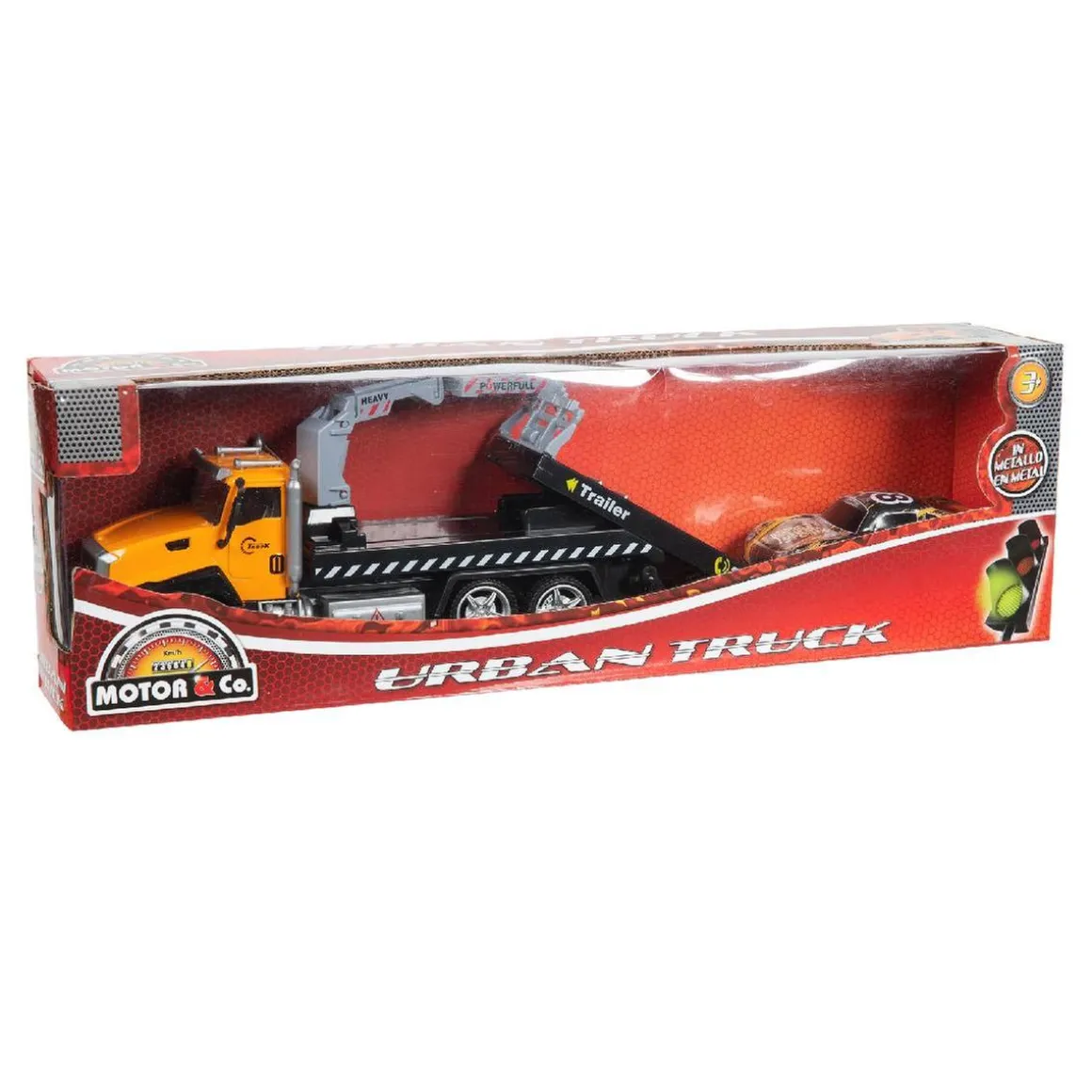 Motor & Co – Camión retrofricción con vehículo, un camión grua y un coche metálicos que corren por fricción.
