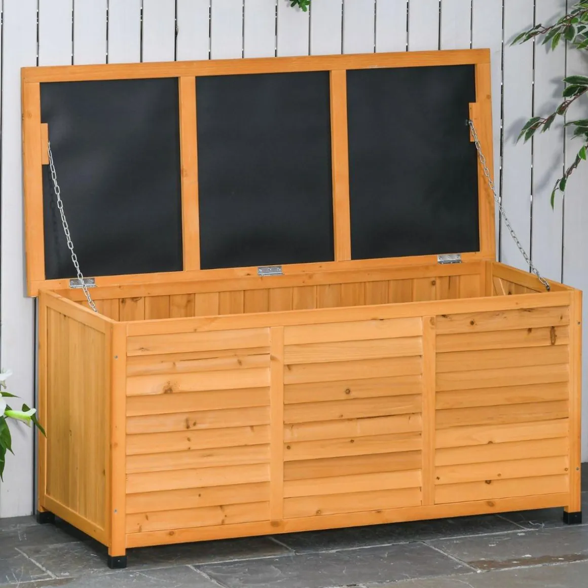 Outsunny – Baúl de jardín de madera. Este baúl de almacenamiento para exterior es una solución ideal para tener en tu jardín. Un amplio espacio para almacenar herramientas de jardinería, juguetes de exterior, etc. Hecho de madera de abeto maciza tratada para resistir a la intemperie y con protectores en las patas para evitar el contacto de la madera con el suelo. Se puede usar como baúl de almacenaje y también para sentarse. Su diseño de persiana ofrece una buena ventilación interior. ¡Funcional y bonito!