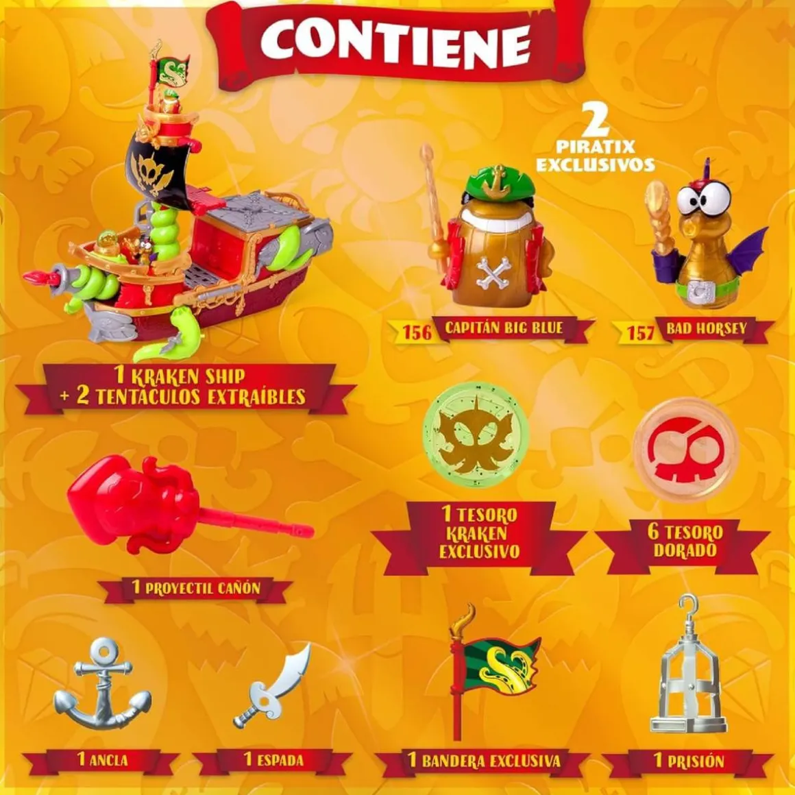 Utiliza el tesoro para apuntar y disparar el cañón, abrir la prisión para liberar los Piratix atrapados y “despertar” al Kraken, que aparecerá en la parte posterior lanzando por los aires todo el tesoro que haya dentro de su boca.