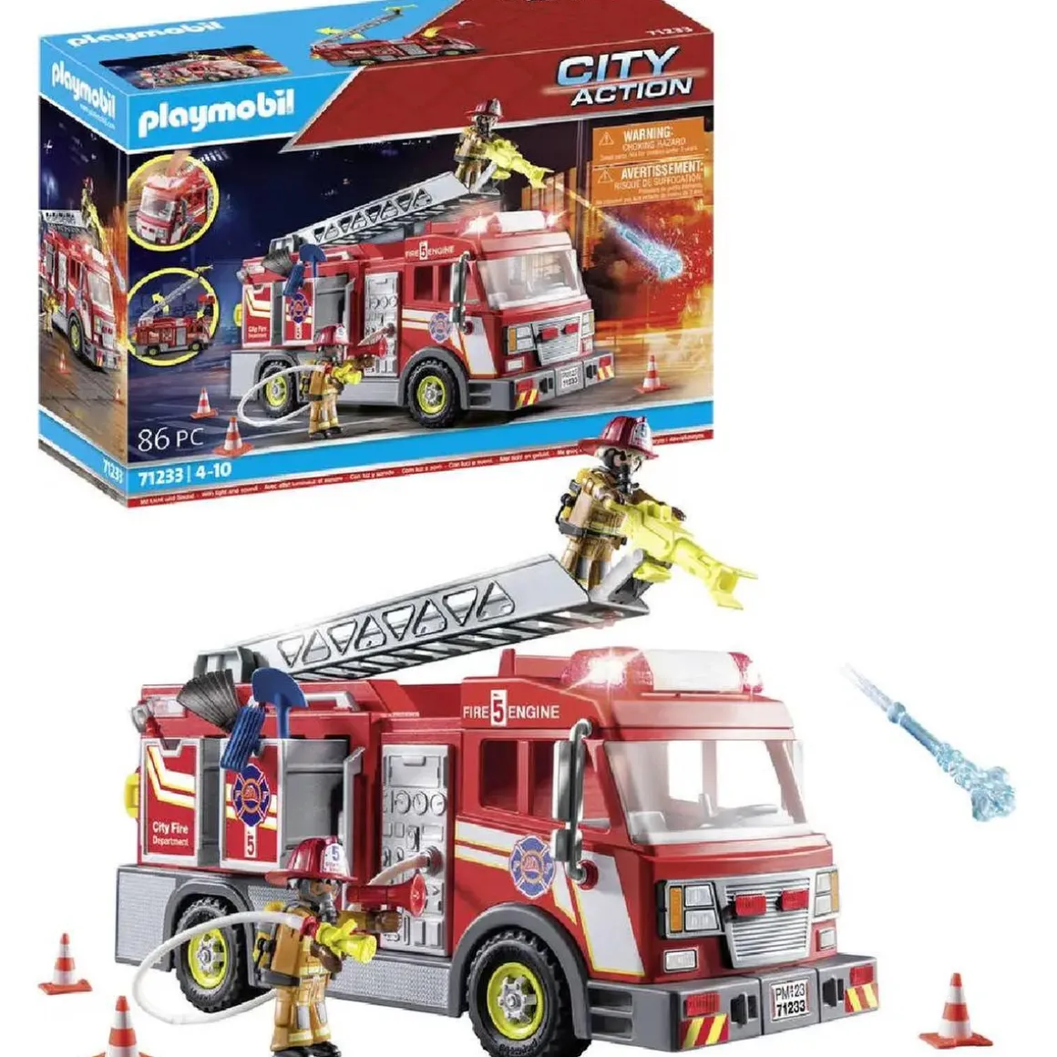 1 camión de bomberos Playmobil City Action con escalera giratoria, cañón de agua giratorio, luces y sirenas, 4 chorros de agua, respirador, bombona de oxígeno y compartimentos de almacenamiento.