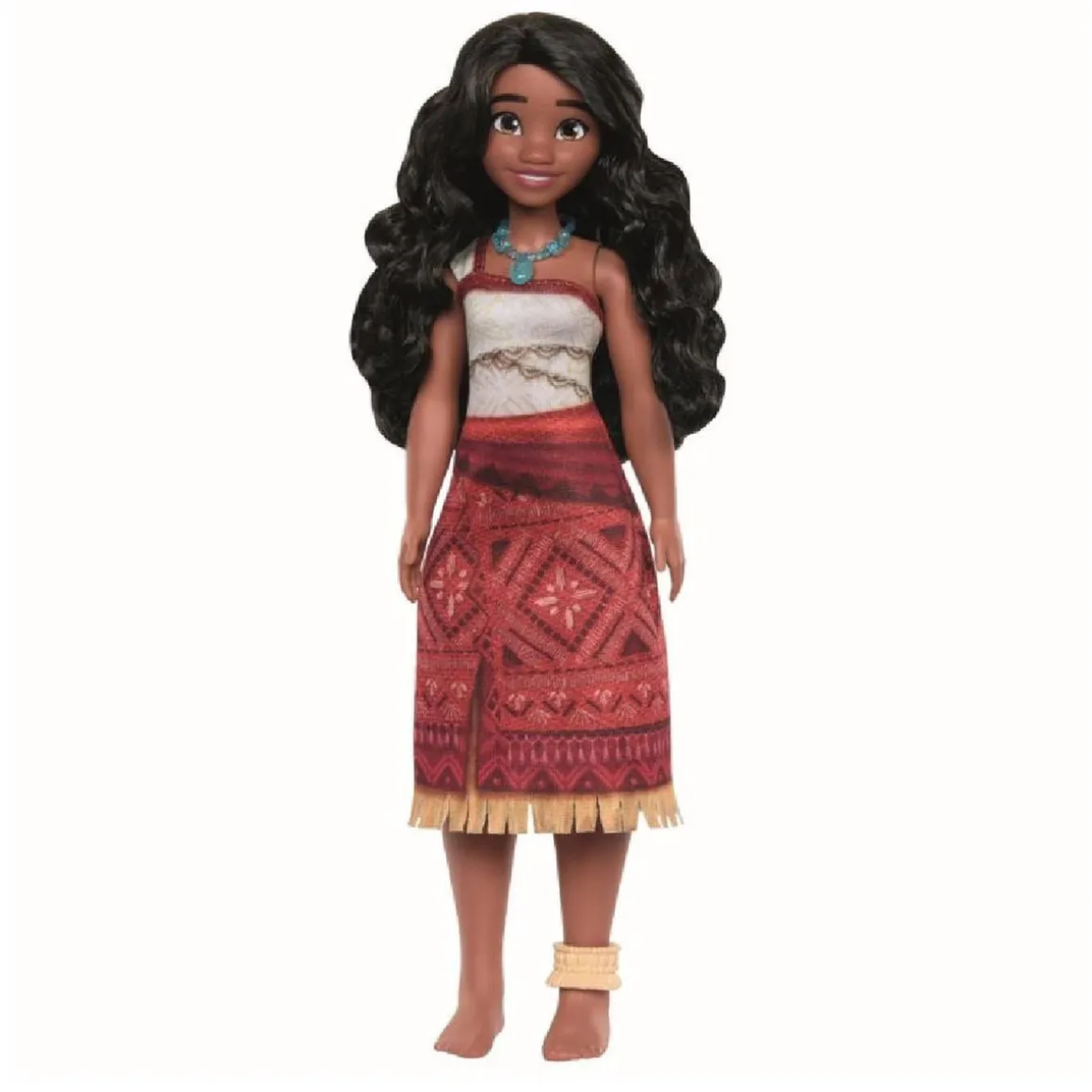 La muñeca Vaiana de 29 cm tiene 5 puntos de articulación y luce su nuevo conjunto de top de tela beige con un tirante con detalles rojos y una falda de tela roja con flecos beige. Incluye 1 pulsera y 1 collar.
