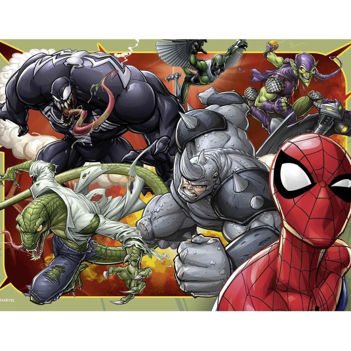 El set incluye cuatro imágenes dinámicas y coloridas que muestran a Spider-man, Spider-girl, Kid Arachnid y Spider-Gwen en plena acción, enfrentándose a villanos como Rhino, Green Goblin, Venom, Lizard y Vulture. Estas emocionantes escenas capturan la imaginación de los niños y los sumergen en el universo de sus superhéroes favoritos.
