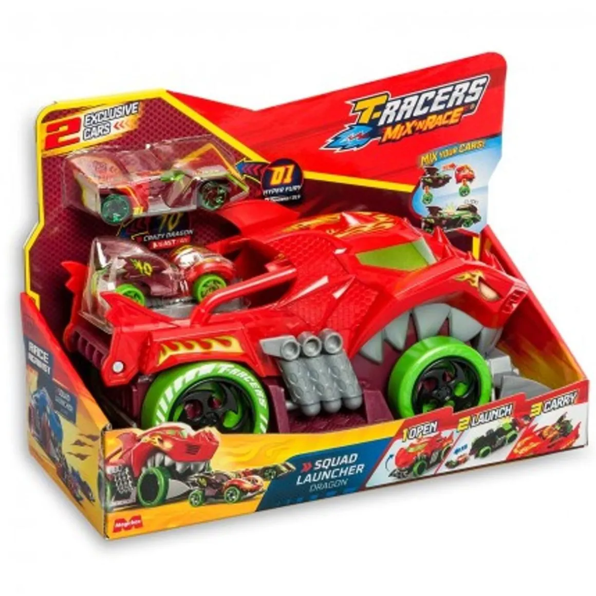 Incluye dos vehículos exclusivos que no encontrarás en ningún otro lugar. Estos coches están diseñados para lograr una máxima velocidad y su configuración permite combinar piezas con otros T-Racers, haciendo que cada carrera sea diferente y emocionante. La adrenalina y la imaginación no tienen límites con el Camión dragón con lanzador.