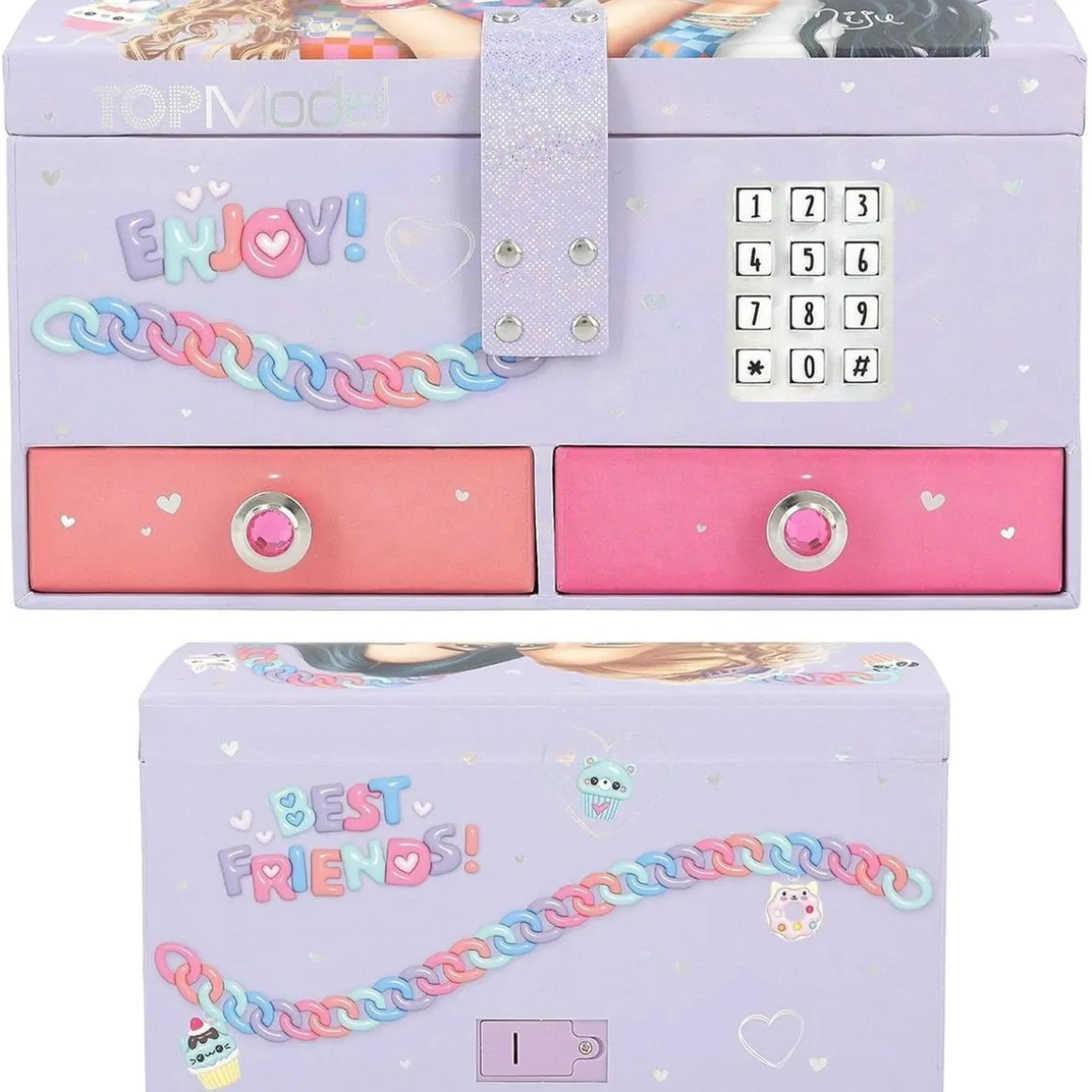 Descubre la magia del «Top Model – Joyero grande con código y sonido», un elegante y divertido organizador que ilumina el tiempo de juego. Diseñado con una estética en un delicado tono lila, este joyero se destaca por sus encantadores motivos de cadenas con colgantes y un diseño único que captura la esencia de TOPModel by Depesche. Los niños pueden guardar sus pequeños tesoros y secretos con total seguridad, gracias a un sistema de código personalizable que añade un toque de misterio y diversión.