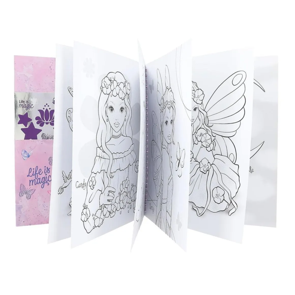 Dentro del libro, encontrarás 40 motivos mágicos que ofrecen una variedad de escenas del encantador universo de Top Model. Cada página es un lienzo de posibilidades, con modelos que tienen alas de hada, vestidos deslumbrantes y compañeros animales extraordinarios. Este libro es más que solo colorear; es una invitación a crear historias y personajes propios.