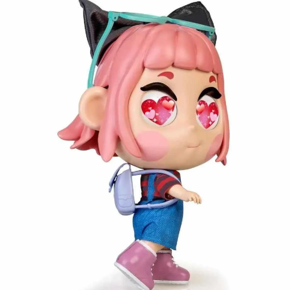 Vestida con un look muy actual y comfy que incluye un peto, camiseta de rayas, botas, gafas y un lazo que decora su divertido pelo rosa.